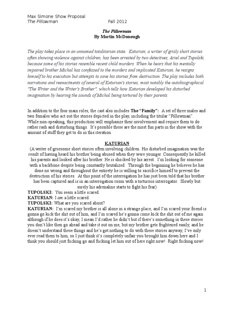 The-pillowmanpdf - Free download as PDF File pdf or read online for free. The Pillowman is set in a totalitarian police state.